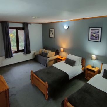 Located just 15m from the main building, this room comfortably sleeps three adults across two single beds and a very comfy sofa bed.